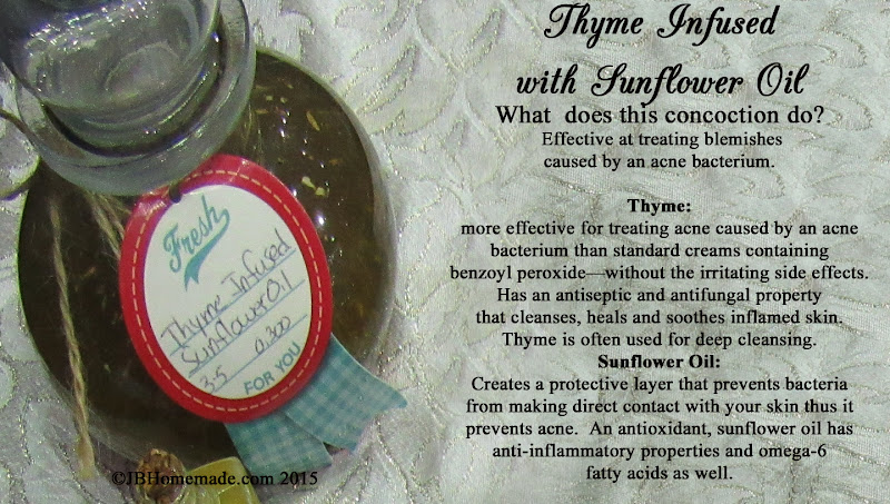 What does this concoction do?Anti-aging and Effective at treating blemishes caused by acne bacterium Thyme is more effective for treating acne caused by an acne bacterium than standard creams containing benzoyl peroxide – without the irritating side effects. Has an antiseptic and antifungal property that cleanses, heals and soothes inflamed skin. Thyme is often used for deep cleansing. Sunflower Oil Creates a protective layer that prevents bacteria from making direct contact with your skin thus it prevents acne. An antioxidant, sunflower oil has anti-inflammatory properties and omega-6 fatty acids as well.
